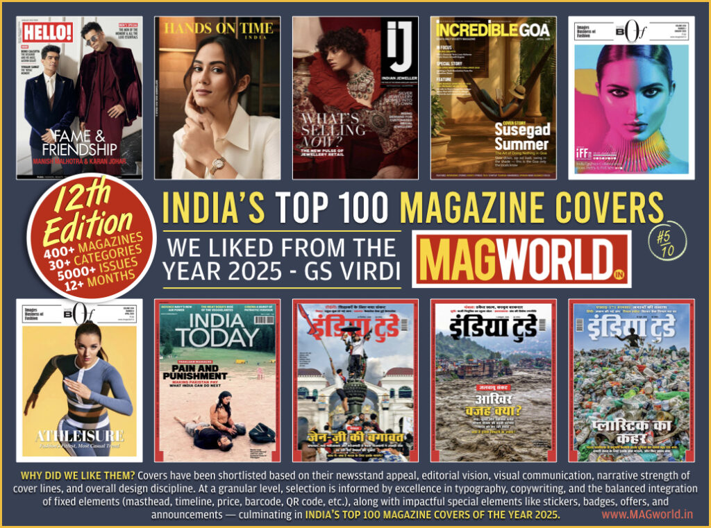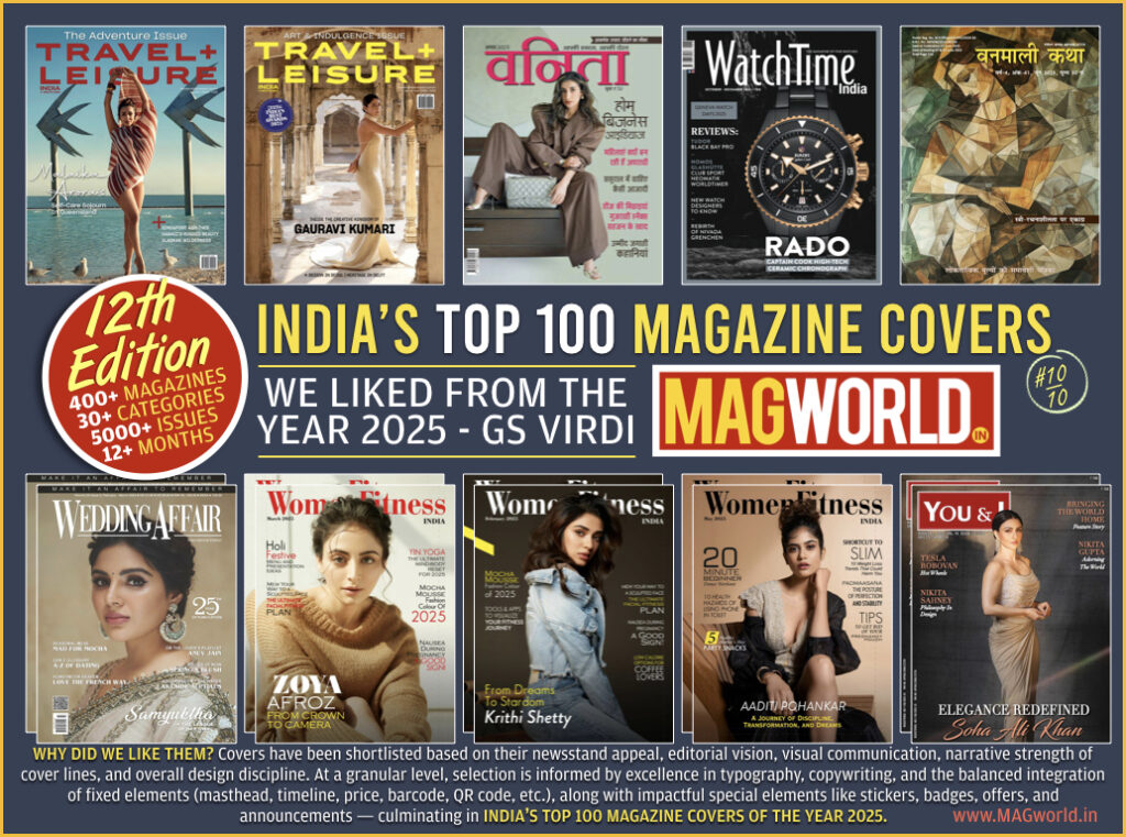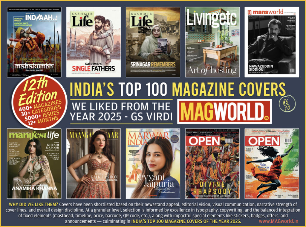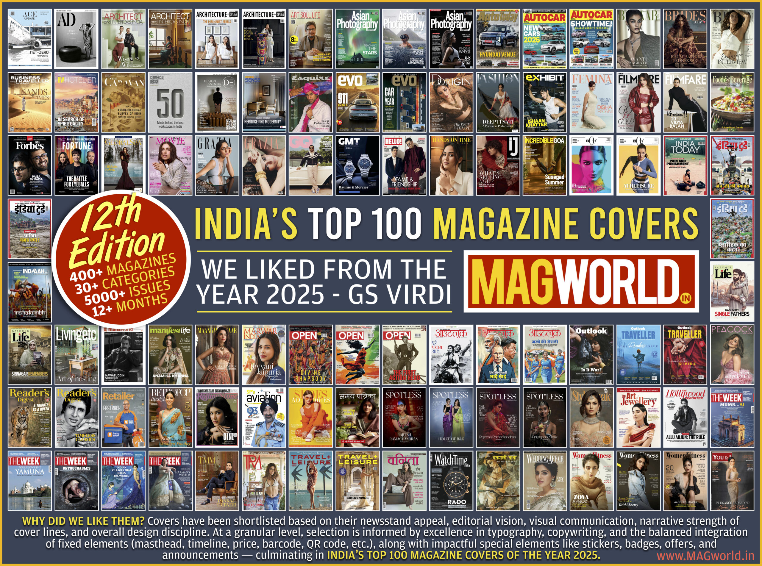 www.MAGworld.in presents the 12th edition of INDIA’S TOP 100 MAGAZINE COVERS that we have liked from more than 400 magazines i.e. 5000+ issues that were released in the year 2025.