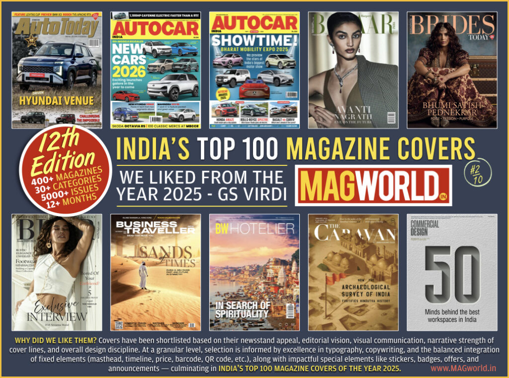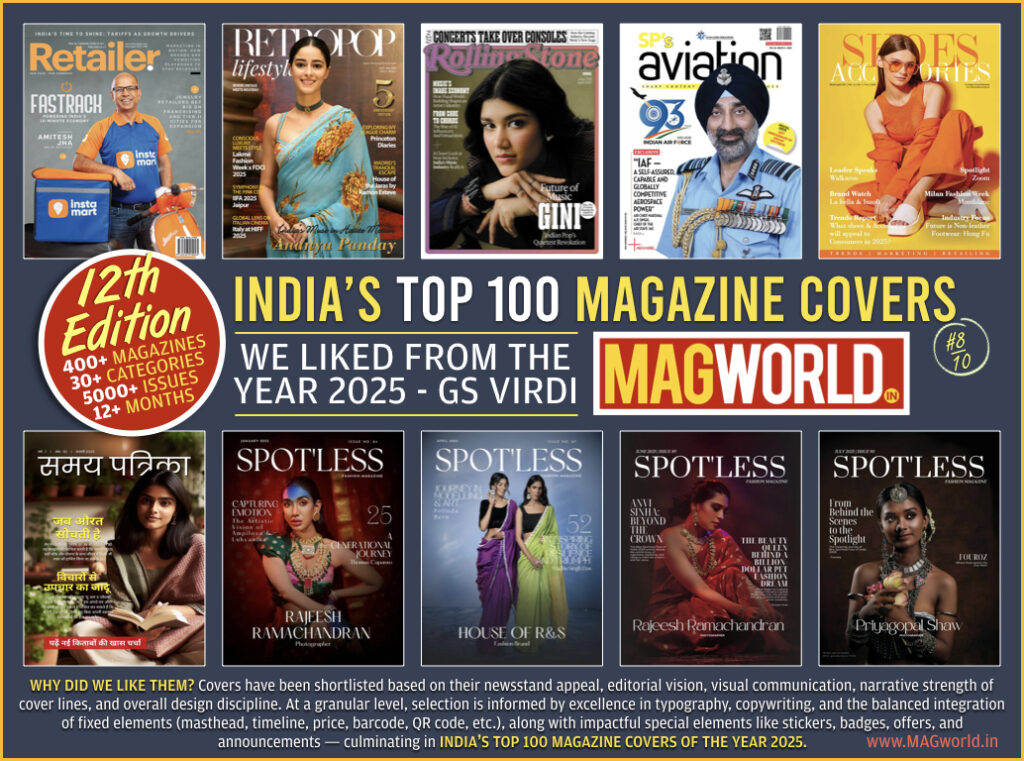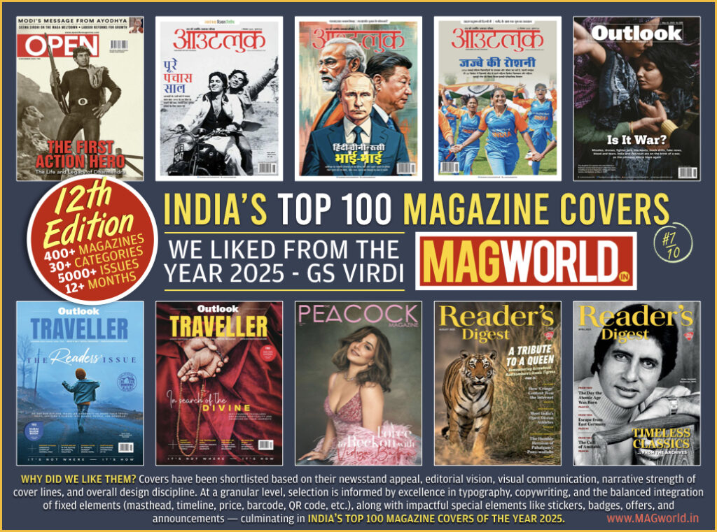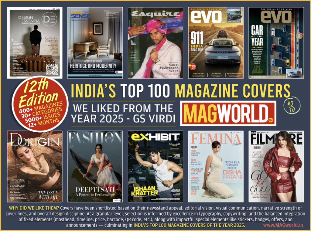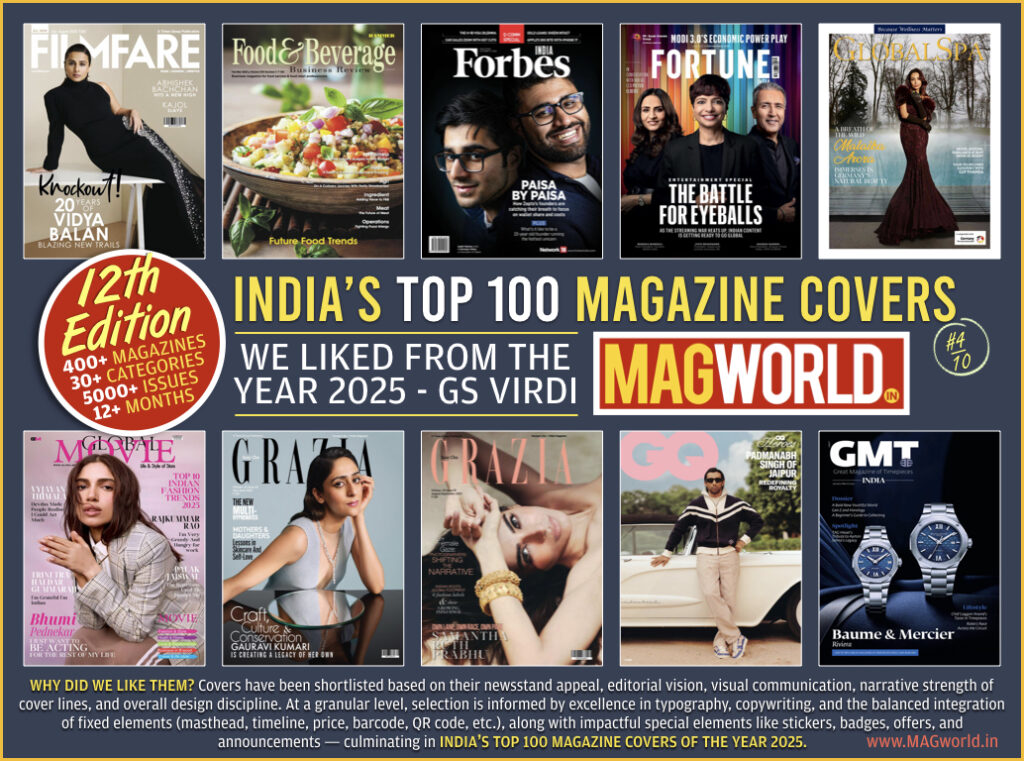 www.MAGworld.in presents the 12th edition of INDIA’S TOP 100 MAGAZINE COVERS that we have liked from more than 400 magazines i.e. 5000+ issues that were released in the year 2025.